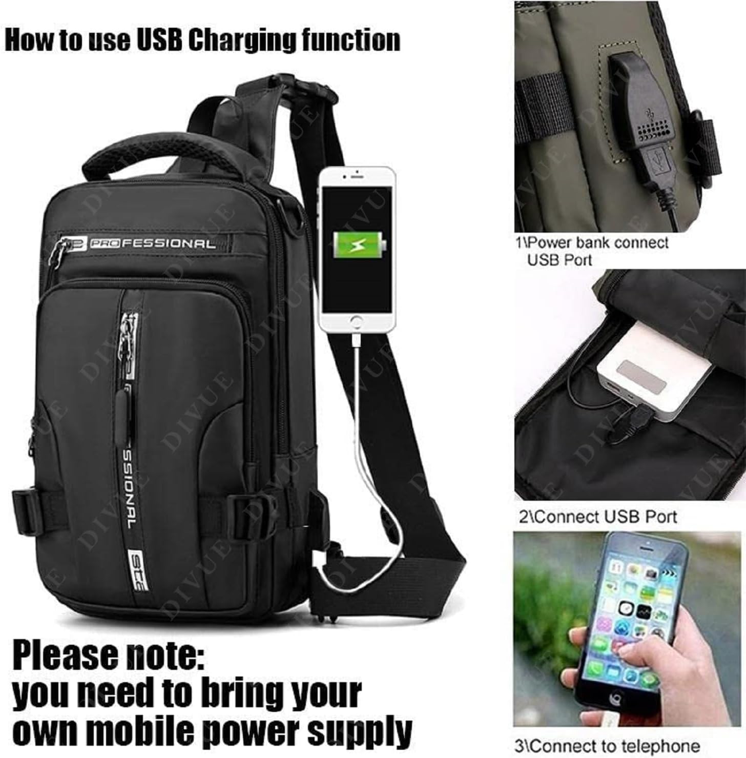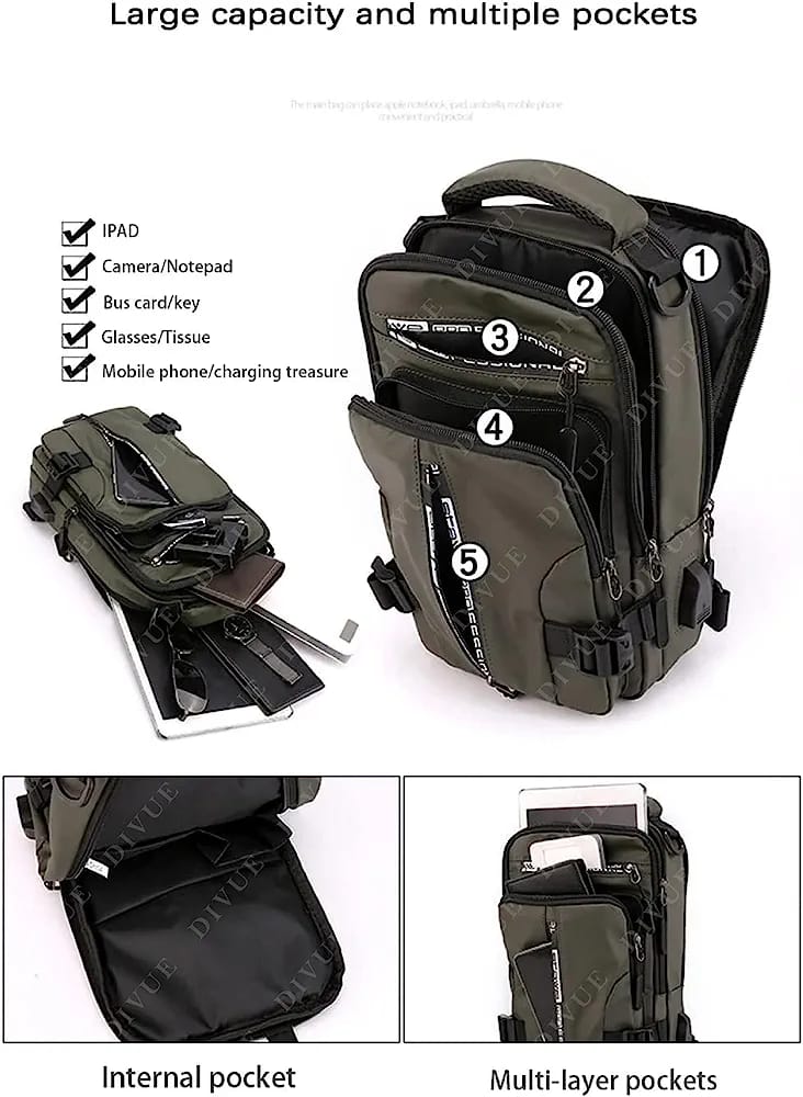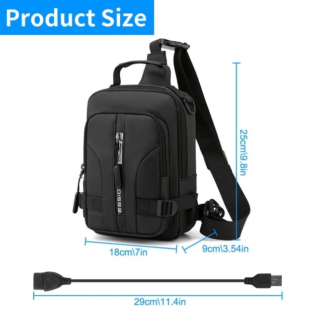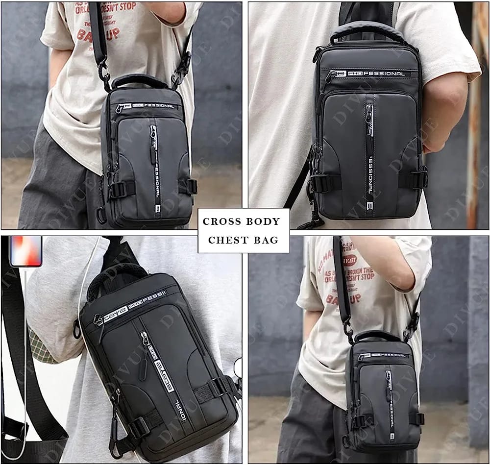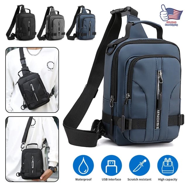 Men Multifunction Patent Nylon Chest Bag , Men Waterproof Crossbody Bag Anti-theft Travel Bag, USB Charging Chest Bag Pack