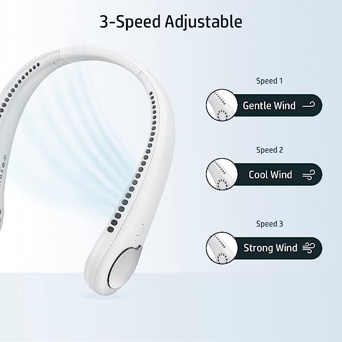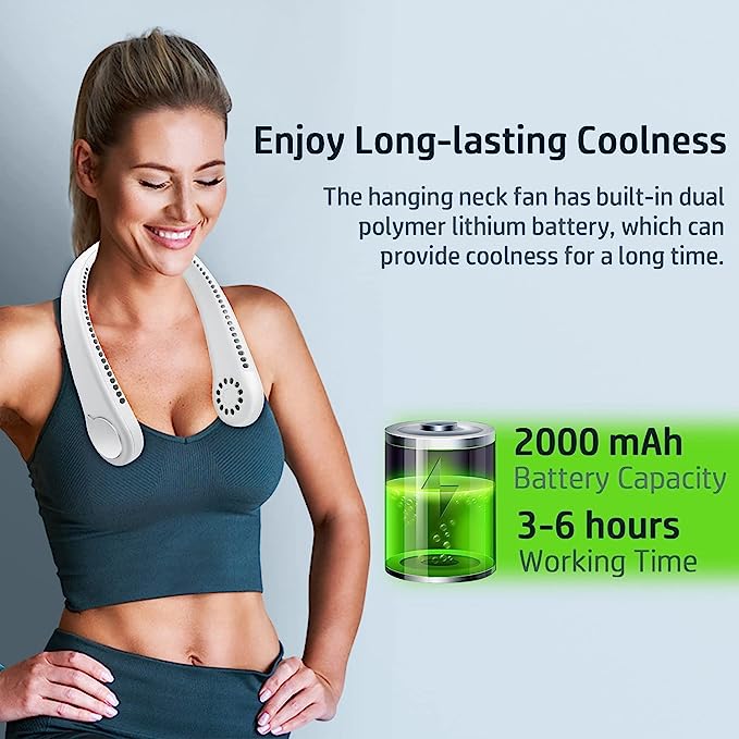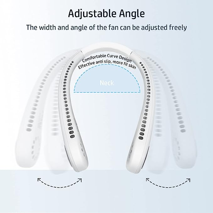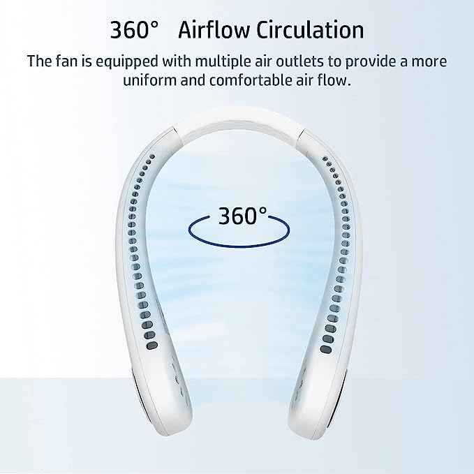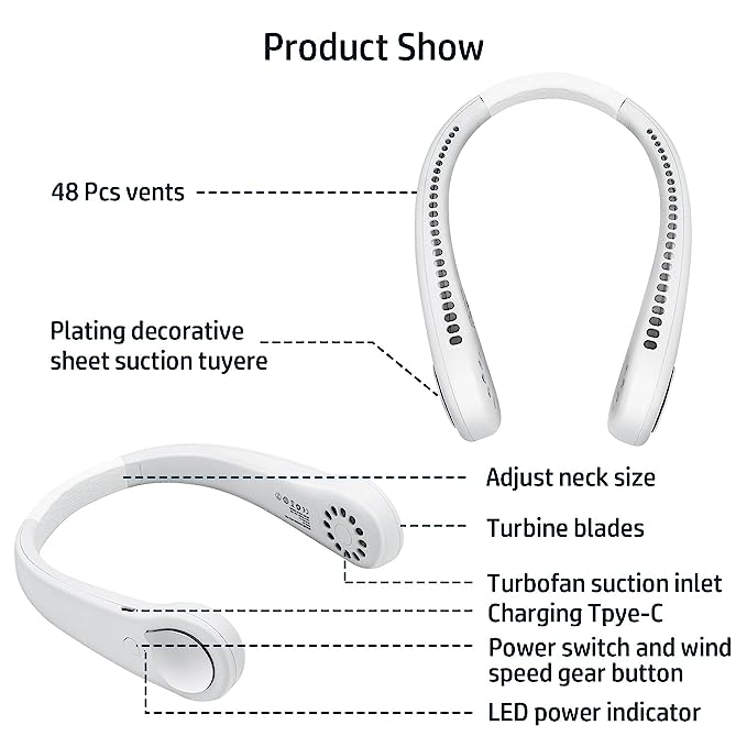 This portable neck fan adopts bladeless design, not getting hair stuck compared to traditional hanging neck fans. Hanging around your neck to free your hands. With 48-hole air outlet, 60 turbine blades design produce more powerful airflow. Keep you cool all the time.