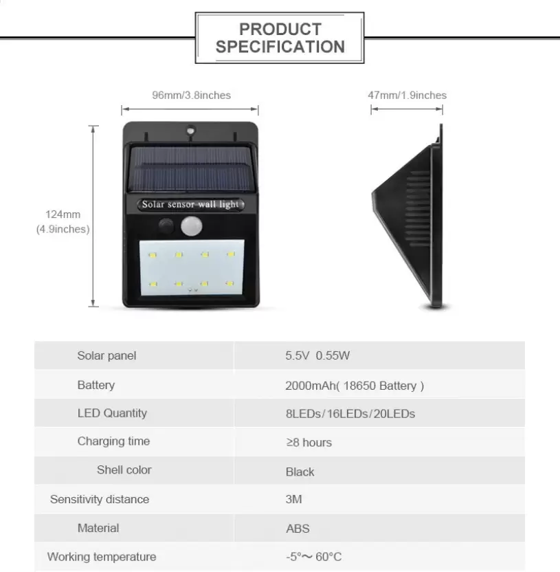 Automatic Motion Sensor Solar LED Deck Lights for Security: The solar deck light turns on automatically in the dusk and turns off at dawn. Dim Light Sensor Mode: when in dark night, the solar deck LED light will be dim without people coming near, however become bright if people comes, and the bright light will last 15-20 seconds until it returns to dim light again. Ultra-Bright Solar Deck Lights: High-powered 20 LEDs provide excellent illumination of up to 160 lumens. This is bright enough to turn night into day and provide security for your home or business. No worry about being outdoors in the dark at night. Solar LED Sensor Light with a large sensor: Sensing range of 10 feet with a 120 degree sensing angle.IP65 waterproof and heatproof, solar powered lights, suitable for most kinds of weathers. Weatherproof and Durable: Fully sealed lamp body surface and waterproof design, with independent waterproof switch. This Led solar lights can withstand years of usage.