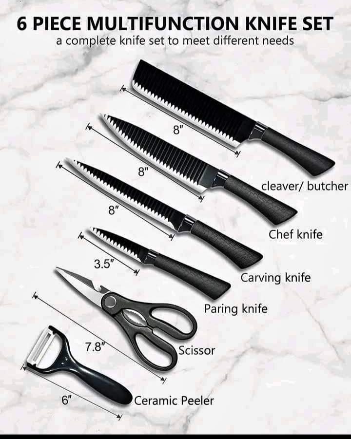 - Includes: Chef Knife, Carving Knife, Small Knife, Peeling Knife, scissors and ceramic peeler